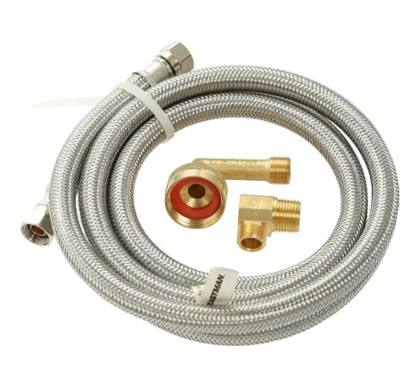 Includes both 3/4 inch. MIP and 3/4 inch. FHT elbows Stainless steel braided Nickel plated brass nuts Fits whirlpool dishwashers 2009 and newer Size: 3/8 inch. OD x 3/8 inch. OD x 72 inch.