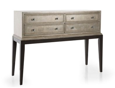 Transitional console table4 storage drawersSolid wood frame in antique gold leaf finishWood legs in espresso finish.Read More