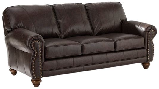 Feel right at home when you relax in this top-grain leather stationary sofa, loveseat, club chair and matching ottoman. The blown, semi-attached square back is banded and corded with the added comfort of a baffled bag in the back. The smooth, rolled arms flow into the stepped-in back where they converge with the contoured and padded lower arms. The front of the arms are accented with brass tacks for a distinguished look. Comfort is not sacrificed by style as the cushion features encased coil springs giving a resilient, yet plush feel.Read More