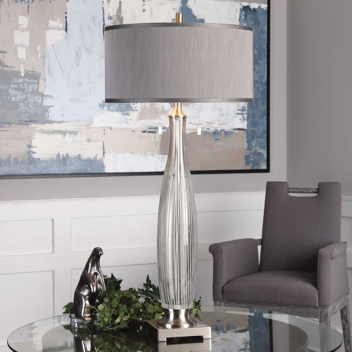 Light smoke gray glass featuring etched vertical stripes accented with plated brushed nickel metal details. The round hardback drum shade is a gray linen fabric with natural slubbing.Read More