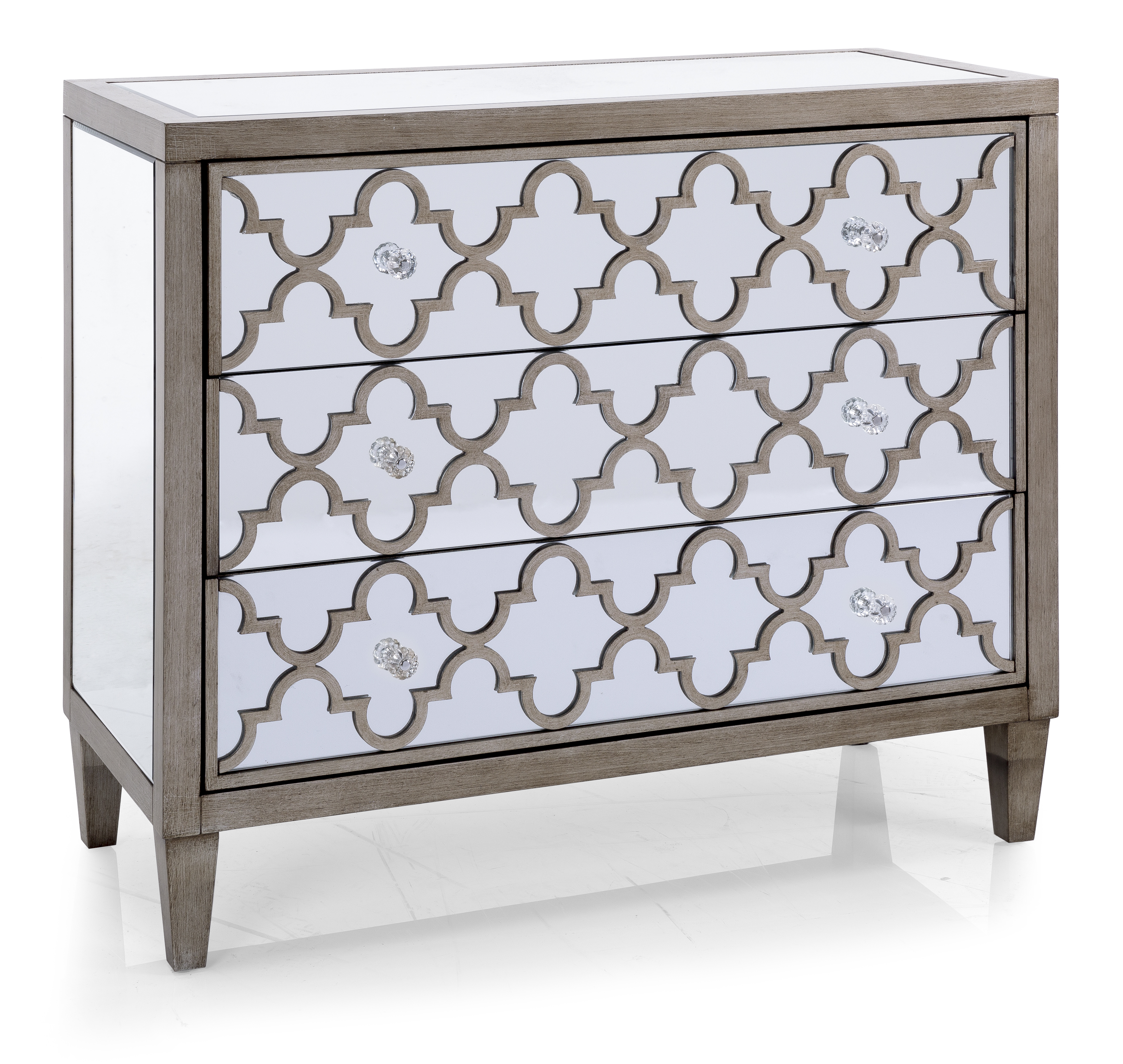 Mirrored chest.Quatrefoil design on 3 drawers.Clear acrylic knobs.Solid wood frame in antique champagne finish.Clear mirror top and sides.Read More