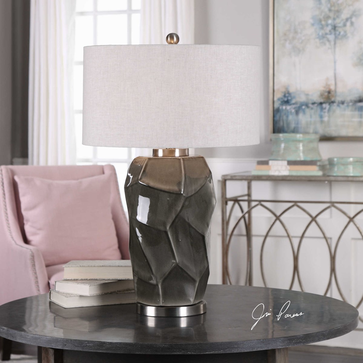 This ceramic lamp mimics an organic rock shape finished in a crackled gray glaze, accented with brushed nickel plated details. The round hardback drum shade is a beige-gray linen fabric with natural slubbing. Due to the nature of fired glazes on ceramic lamps, finishes will vary slightly.Read More