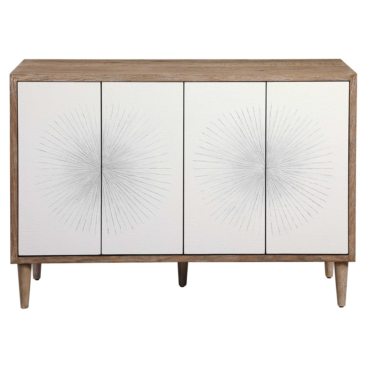 Showcasing hints of Scandinavian design, this four door accent cabinet provides a functional storage piece with versatile style. Featuring matte white textured doors with a striking starburst design with ombre gray centers. The case is layered in naturally finished oak veneer with wire brushed details, set on tapered legs. Each side opens to reveal two adjustable shelves.Read More
