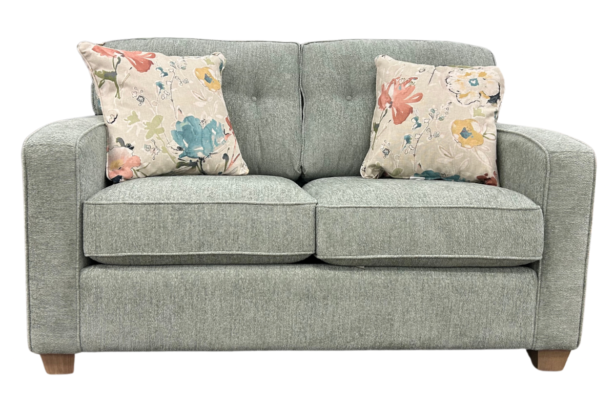 Decor-Rest® 2298 Loveseat features box seat cushions with contrast or self-welt. Semi-attached button back cushions with self or contrast welt/buttons. Shown in Grade 43, Clover Aqua fabric.Read More