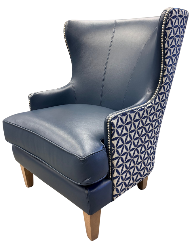 Arm chair featuring two-fabric upholstery, T-box seat and nailhead trim. As Shown Grade 63 Fabric (Gardinia Navy) with Grade 100 Leather (Ostia Blue)Read More