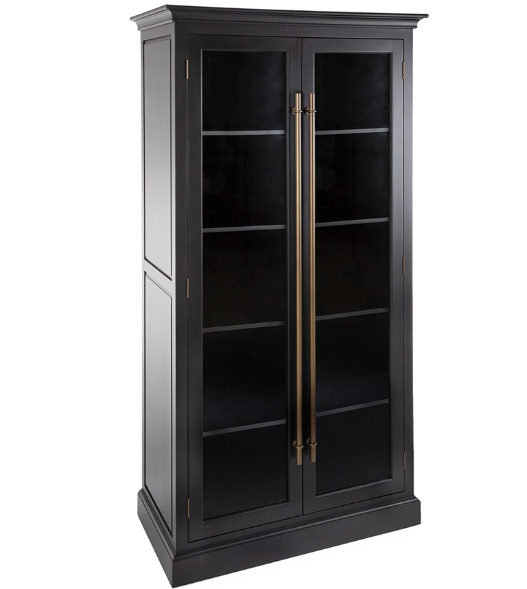 Upright cabinet in black with antique brass bar handles and tempered glass door.Read More