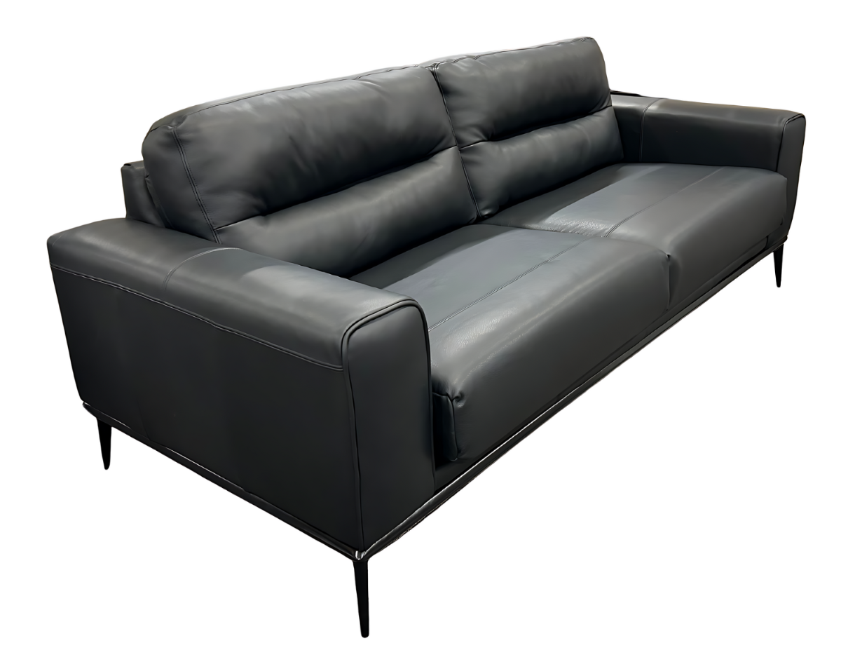 This chic sofa was built with sinuous spring construction, a semi-attached back, and box seat with regular stitch. It is highly customizable, offering a choice of different metal leg shapes and finishes. It boasts a wood trim base and metal reinforced frame. Shown here in Grade 200 Leather, Dream Black.Read More