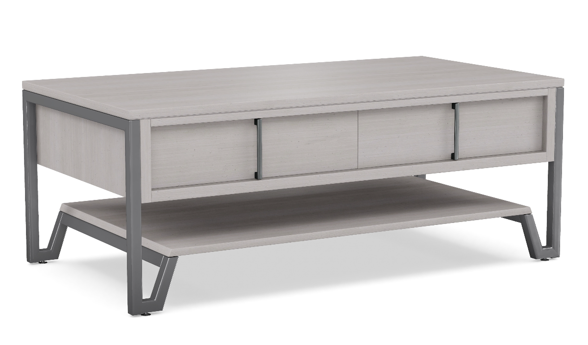 Milestone Coffee Table features maple construction, transitional style, and metal base. Shown in Owl Grey finish.Read More