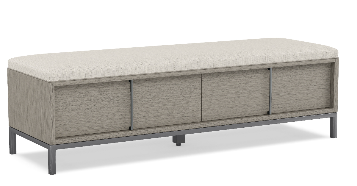 Milestone Storage Bench features maple construction, transitional style, and soft close drawer guides. Shown in Dusk finish.Read More