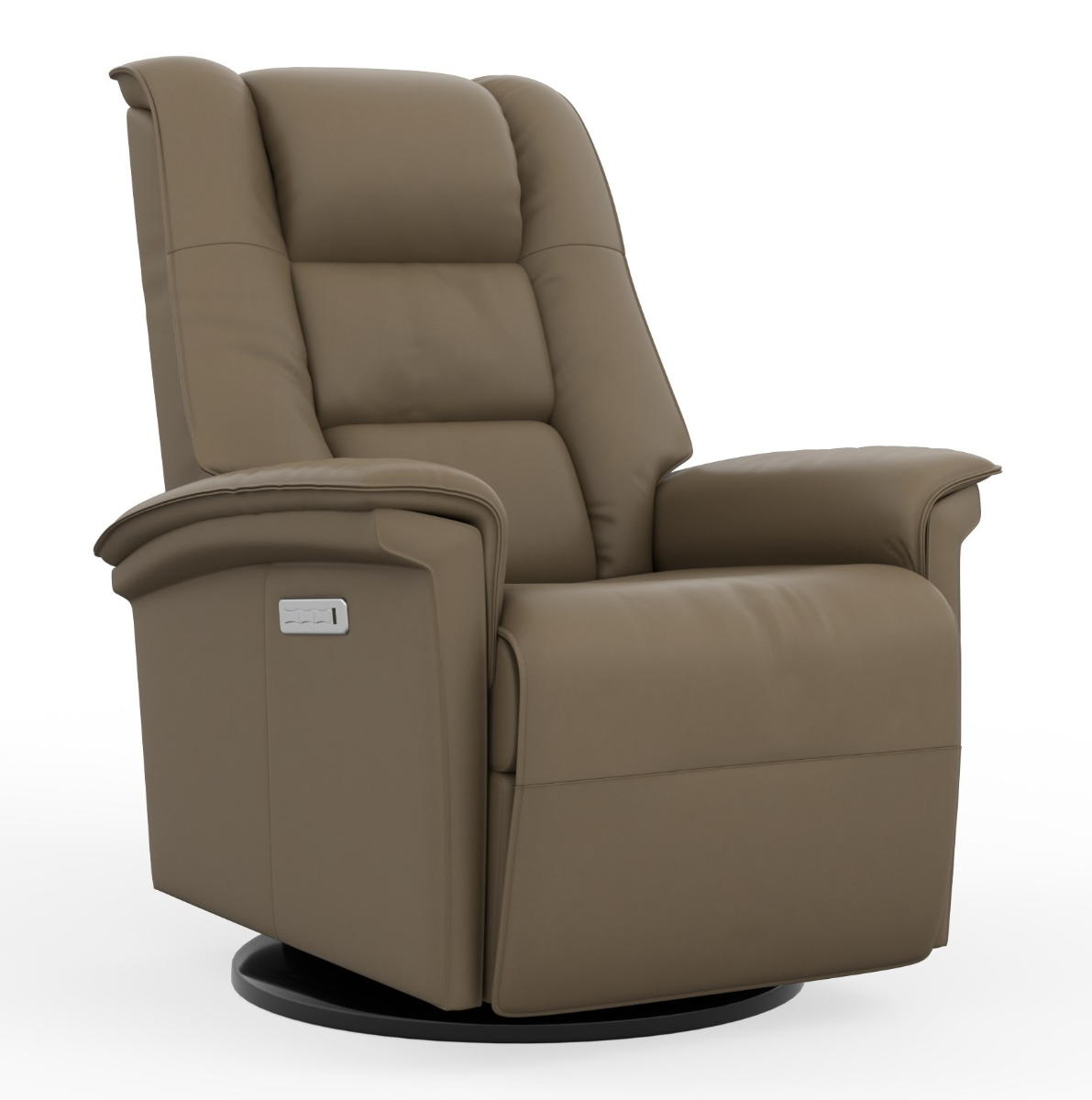 The Fjords Paris swing relaxer, features a 3 motor system. One for the motorized reclining and footrest control, a second for the motorized lumbar and a third for the headrest support which changes the support angle of the headrest. The overall seating experience gives your body correct ergonomic support. The design is available in two sizes, small and large. Black base is standard on Paris.Read More