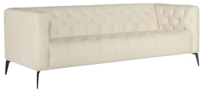 The Nicolla stationary sofa in Baldwin natural performance fabric exudes modern traditional charm. Its chesterfield-inspired shelter arm design, combined with button tufted detailing, offers a blend of elegance and comfort. The heathered two-tone sand-colored flat weave fabric adds sophistication, while tall matte black metal tapered legs enhance its modern, airy appeal.Read More