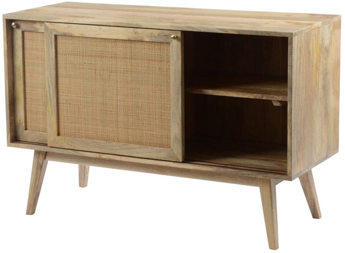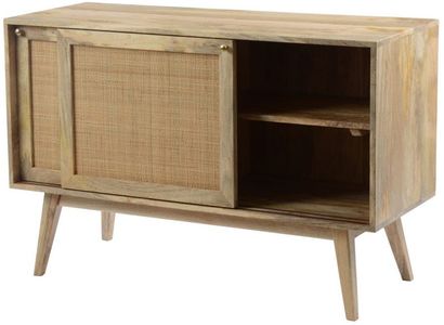 The Reed sideboard is the perfect sidepiece. Natural wood grain, whorls, and knots lend it a bohemian or rustic look in your home. Its two sliding reed doors feature golden knobs for a modern touch.