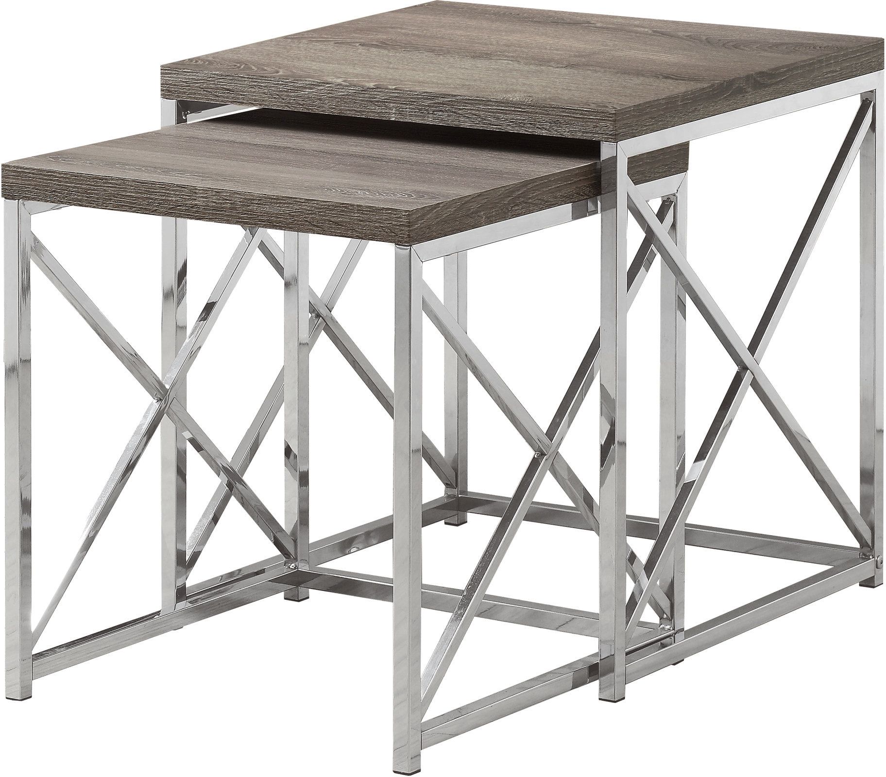 This set of 2 nesting end tables bring a warm welcome to you and your guests with its thick tabletops in a taupe finish supported by elegant chrome metal bases in a sturdy X-design. Multi-functional for display or storage, these accent side tables can be slid together or used separately, and they are the perfect size for your apartment, condo or small home thanks to the space-saving stacking design. They will surely modernize any room, entryway, office or bedroom.