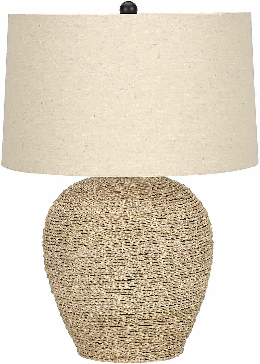 Add a refined boho ambiance to your living room, home office, or bedroom with this stylish and fashionable 25"H table lamp. The airy, textured ginger jar shaped base is made from durable natural rattan topped with a drum shaped beige linen shade and finished with a round black finial.Read More