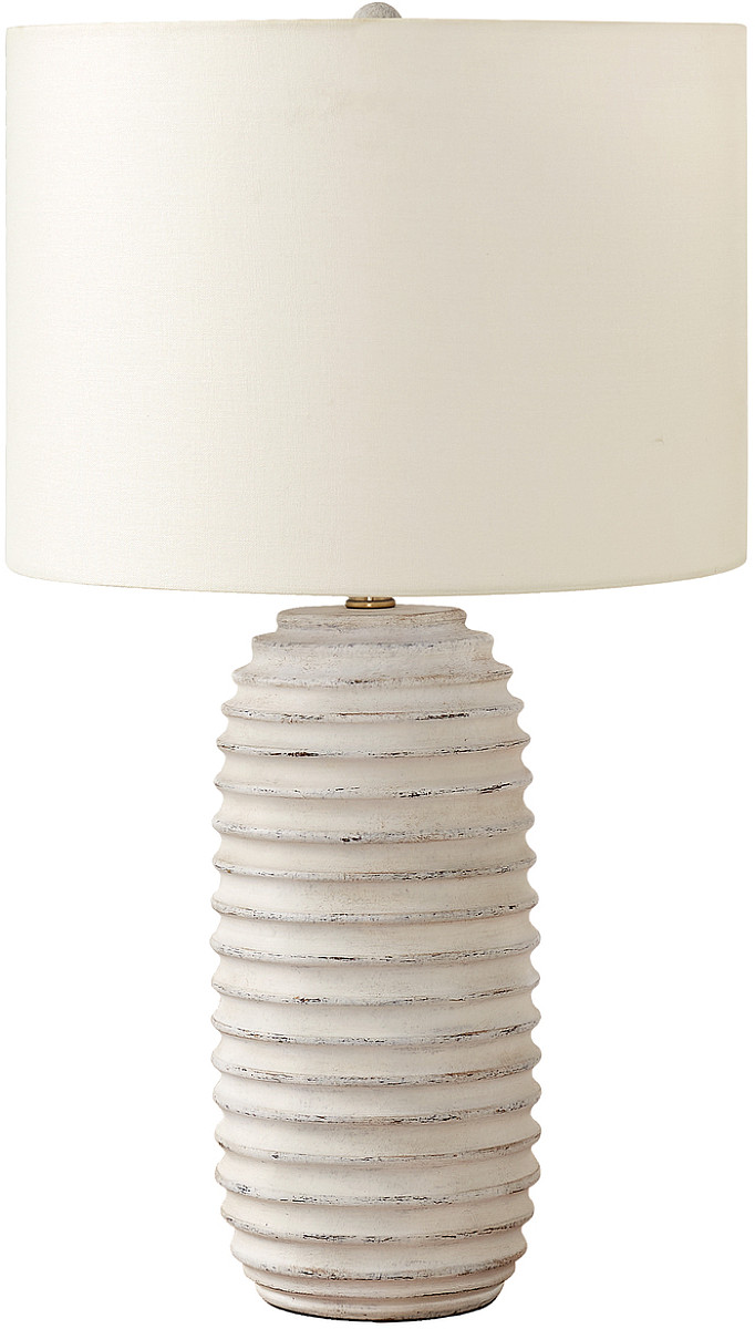 Brighten up any office, living room, or bedroom with this stylish, textured 28"h table lamp with a distressed cream resin base in a ridged, elongated beehive design, and chic ivory linen fabric drum shade topped with a grey wood finial