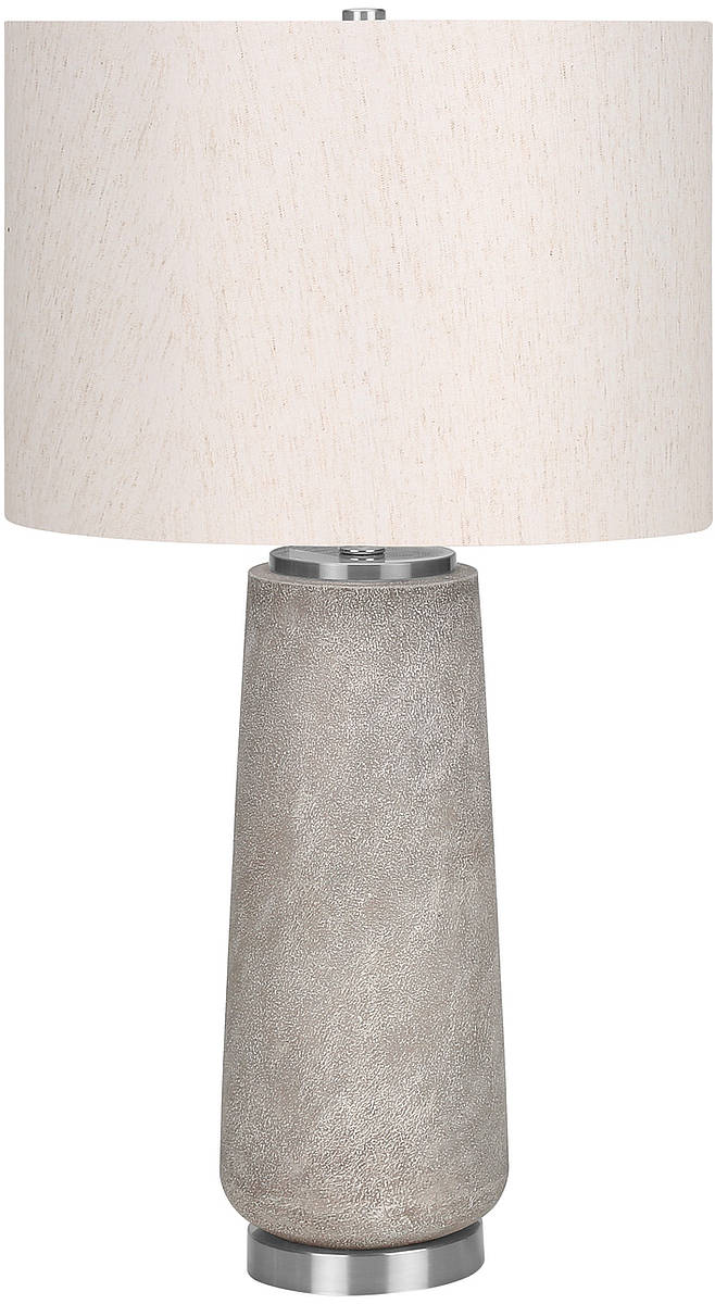 Make your room shine with this stylish and fashionable 29"H table lamp! The modern designed, grey resin cylinder textured base and polished silver metal accent is topped with a ivory linen drum shade, and finished with an elegant silver finial.Read More