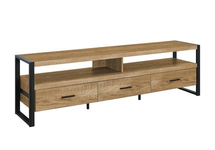 This 72-inch TV stand console blends a warm mango wood-look finish with a bold black metal frame, creating a fashionable style that anchors any modern living room