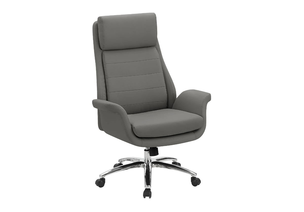This upholstered office chair features a supportive high back design with foam cushioning and a dark grey leather-look finish for a comfortable seating experience during long hours of work at your computer desk