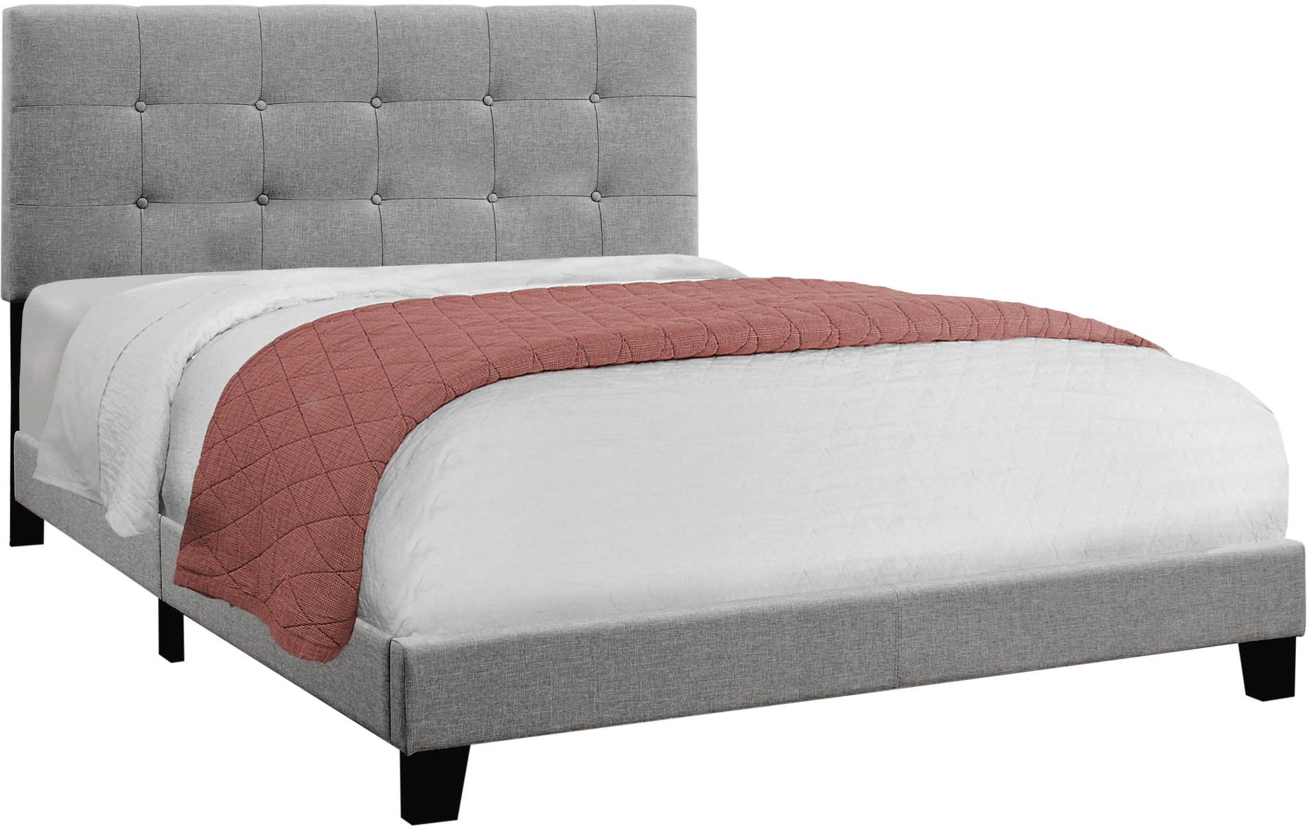 Low profile platform Queen bed frame upholstered in a beautiful grey linen-look fabric; padded headboard boasts an elegant tufted design