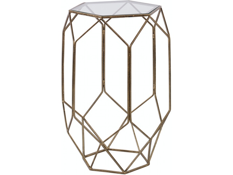 This contemporary geometric prism style accent is constructed from solid iron and finished in a lightly antiqued gold, topped with clear glass.Read More