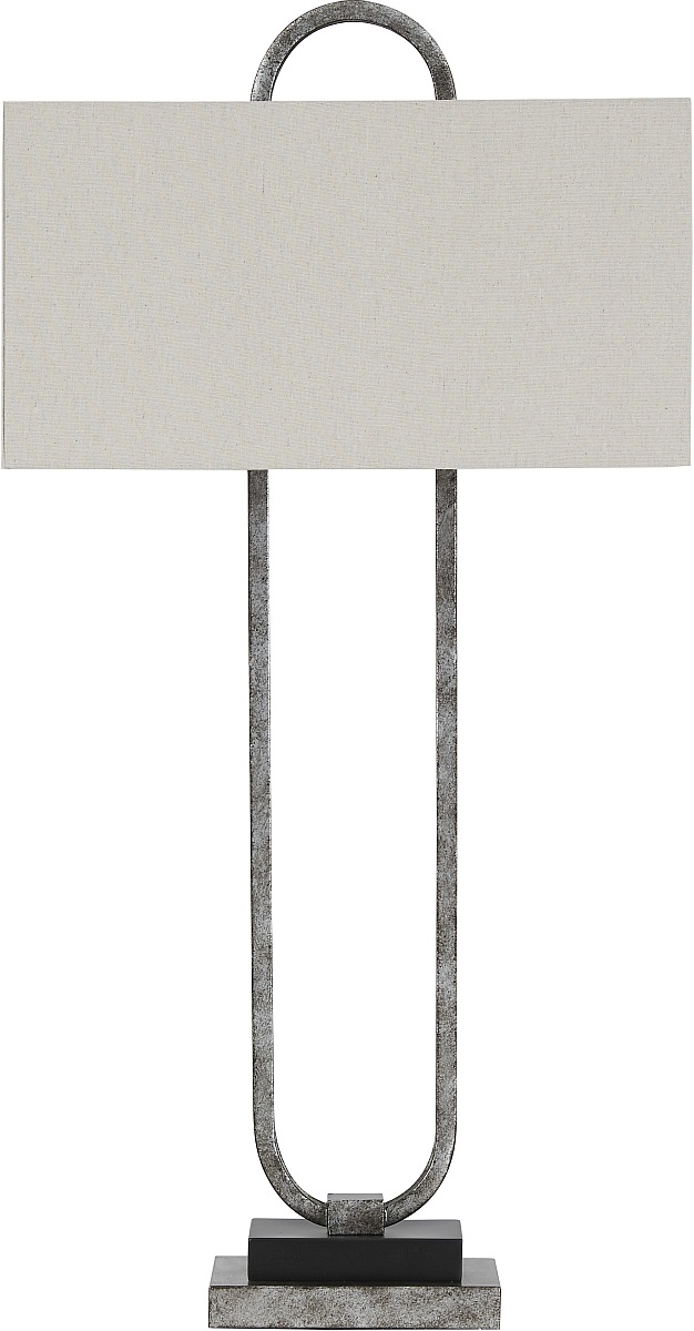 This table lamp, with its open, geometric design, draws the eye and is visually stunning. The antiqued silver metal body with rectangular hardback shade completes the look. This table lamp is sure to be a showpiece wherever you use it.