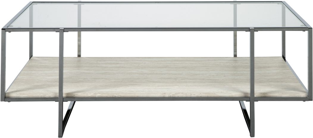 Contemporary style gets a modern attitude in this cocktail table. A tempered glass top showcases the replicated travertine stone shelf. The box design of the metal frame creates open space to offer the illusion of more room.Read More