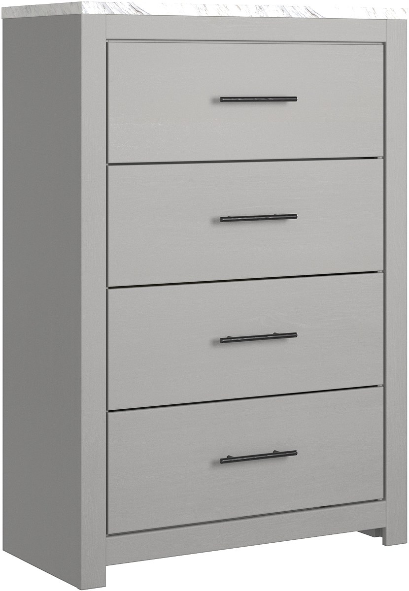 Cool, clean and casually modern. This chest’s wispy dove gray finish and faux Calcutta marble top set the tone for your calming sanctuary. Large linear pulls add dimension and authenticity. Four smooth-gliding drawers neatly accommodate your wardrobe needs. Assembly required for this product.Read More