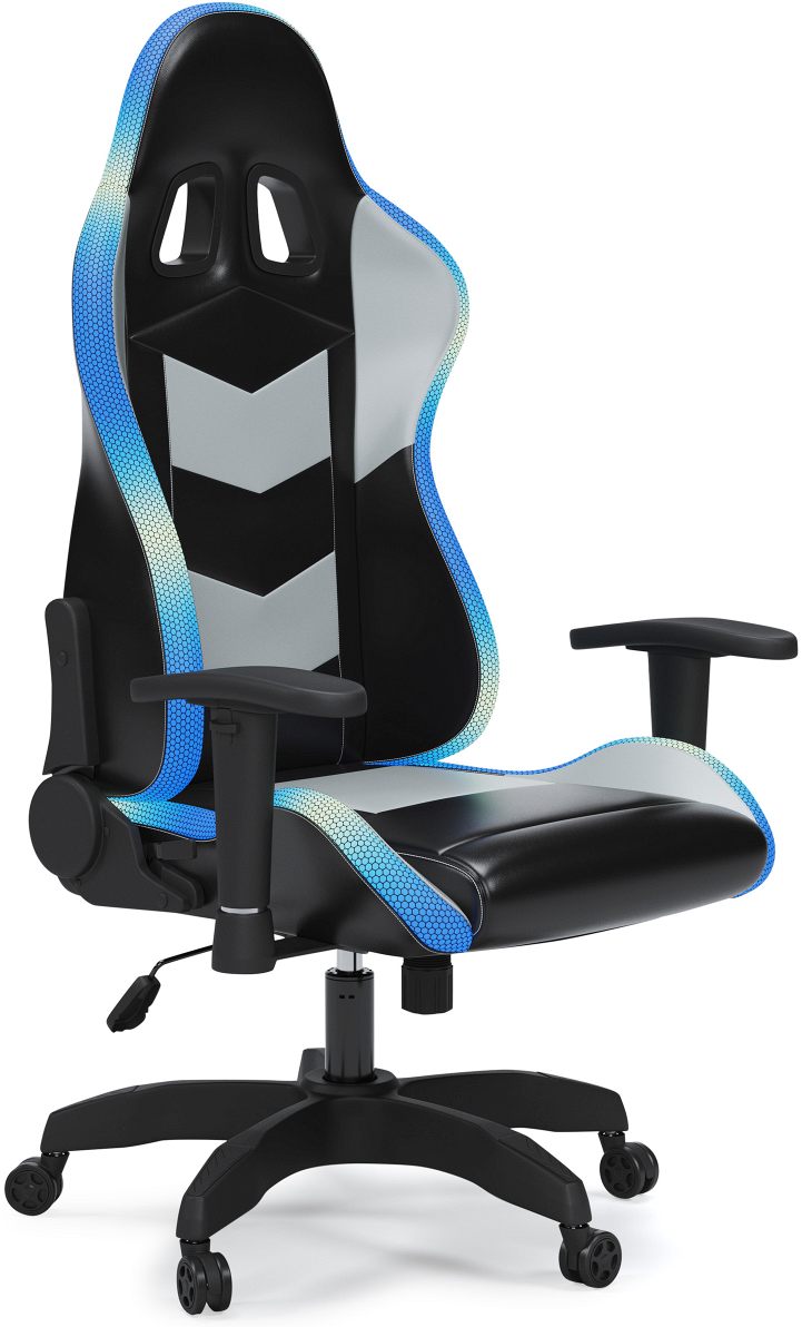 This swivel office chair with comfy contoured seat and cutting-edge design is upholstered in a durable faux leather in gray and black. Cleverly integrated into the chair: powered LED lighting to enhance the gaming experience. Choose from six different colors or stream a mix of color using the remote control. With a swivel base, smooth-gliding casters and adjustable seat height/tilt feature, this office chair with fully reclining backrest has serious game.