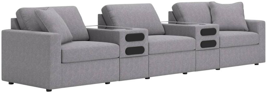 Includes 5 Modular Pieces: Left-arm facing corner chair, armless chair, 2 audio consoles with storage and right-arm facing corner chair