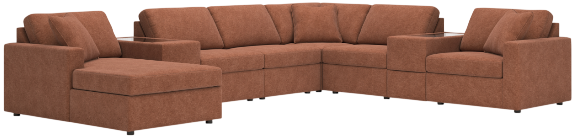 Includes 8 Modular Pieces: Left-arm facing corner chaise, 3 armless chairs, 2 consoles with storage, wedge and right-arm facing corner chair
