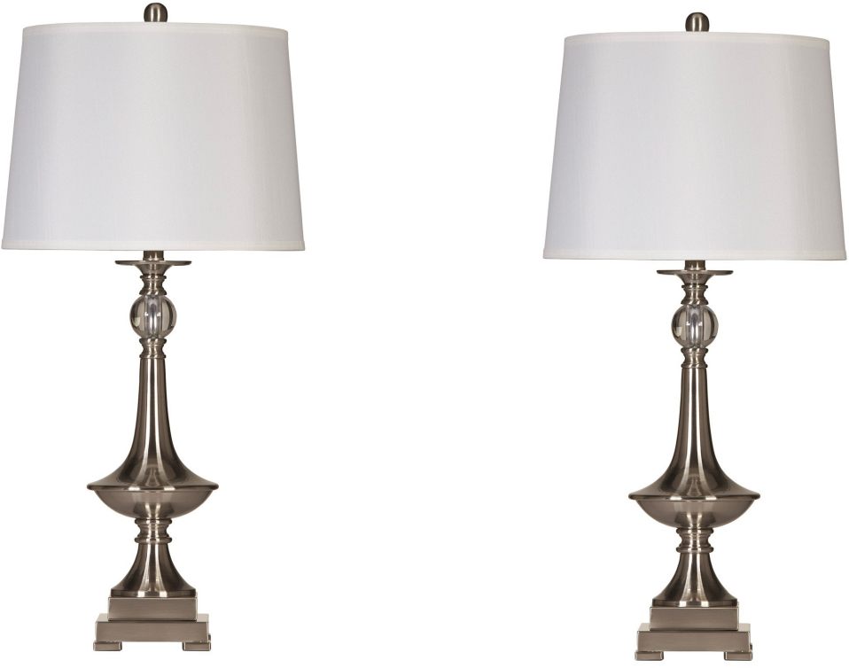 Accent your home with the Newlyn table lamp set. Stacked-square pedestal supports the metal base, while crystal accent piece adds flair. White drum shade diffuses the light, creating a warm glow that reflects nicely off silver base.Read More
