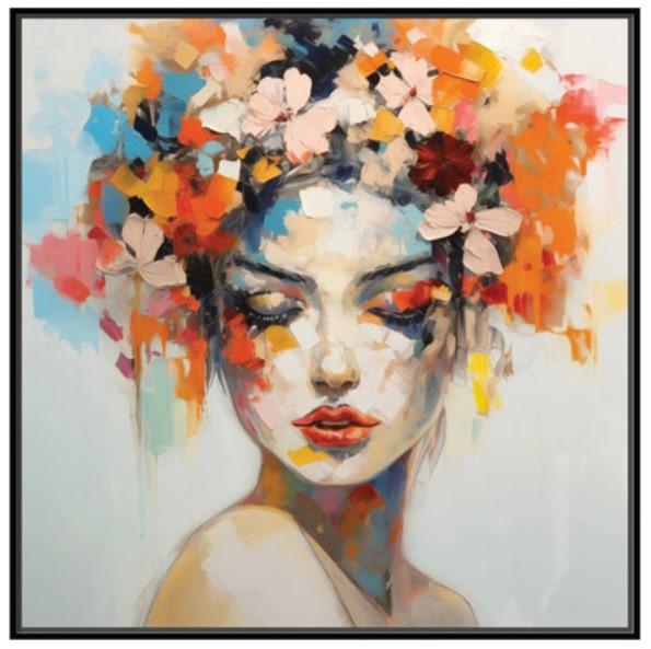 Female with floral headdress in shades of orange, pink, blue, yellow, black, gray and white