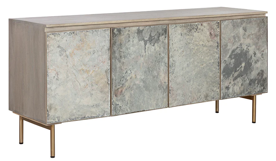 Rich with texture, this unique sideboard illustrates the beauty of mixed materials coming together in harmony. Features a grey solid mango wood frame with slate veneer on the door fronts. Completed with stainless steel legs in a brass finish. Made in India: with refined craftsmanship, this design was brought to life by skilled local artisans. By nature, these materials develop unique imperfections such as fissures, markings and colour variations for a truly one-of-a-kind piece. As wood is an organic, porous material, these pieces will contain natural variation of texture and may also exhibit fine indentations and cracks. Wood pieces will also display a disparity of colour and grain, and visible knots and burls that add to the character of each piece. Due to the organic material on the cabinet doors, variations in colour may occur on actual product.Read More