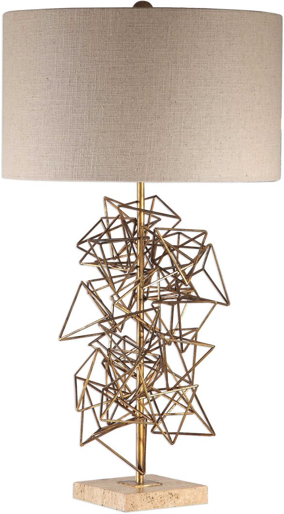 This abstract sculpture is constructed from hand forged steel pyramids, finished in a metallic antique gold, displayed on a desert sand marble foot. The round hardback drum shade is a light beige linen fabric with vertical slubbing.Read More