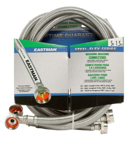 The Eastman® 2-pack 5-ft stainless steel washing machine connector feature a PVC core, multi-filament braided nylon reinforcement, a clear vinyl outer shell, and a grade 304 Stainless Steel braided exterior that is designed to prevent kinking and crimping. The hoses include a 90° elbow for tight spaces. The washing machine connectors resist corrosion and are easy to install.Read More