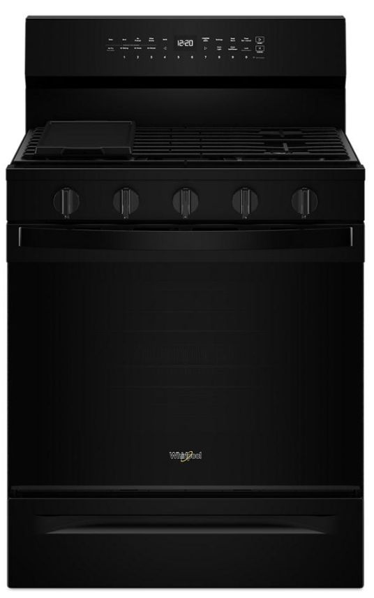 Whirlpool® 30" Black Freestanding Gas Range features SpeedHeat™ Burner, Air Cooking Technology, EZ-2-Lift™ Hinged Cast-Iron Grates, No Preheat Air Fry, Steam Clean, No Preheat Mode, Griddle Zone, and Keep Warm Setting.Read More